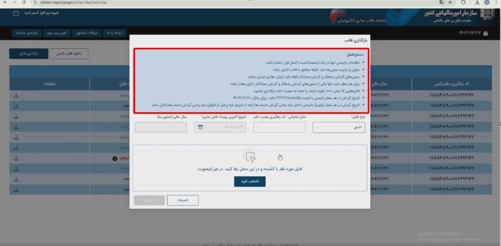 قالب اکسل دانلود شده باید مطابق با دستورالعمل تکمیل اطلاعات دفاتر تجاری الکترونیکی تکمیل شود. مؤدیان پس از کلیک بر روی دکمه بارگذاری فایل، با صفحه ای با عنوان «بارگذاری قالب» مواجه میشوند. در این صفحه دستورالعملهای تکمیل فایل اکسل به شرح زیر ارائه شده است: