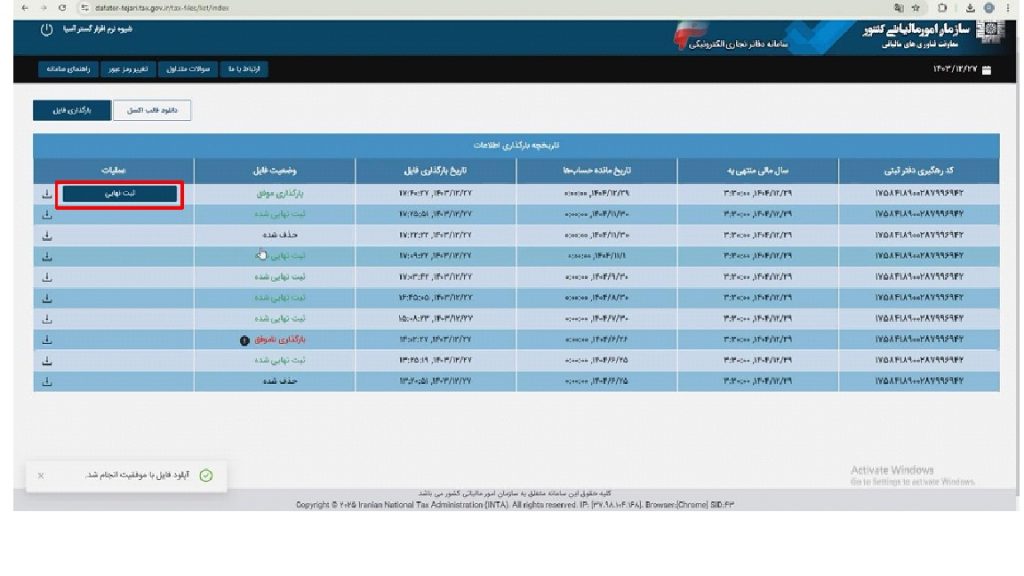وضعیت آخرین فایل بارگذاری شده، در سطر اول این جدول قابل مشاهده است. در صورت مشاهده وضعیت بارگذاری موفق در ستون وضعیت فایل، مؤدی بایستی بر روی دکمه ثبت نهایی کلیک کند. دکمه مورد نظر در شکل زیر با کادر قرمز رنگ مشخص شده است.