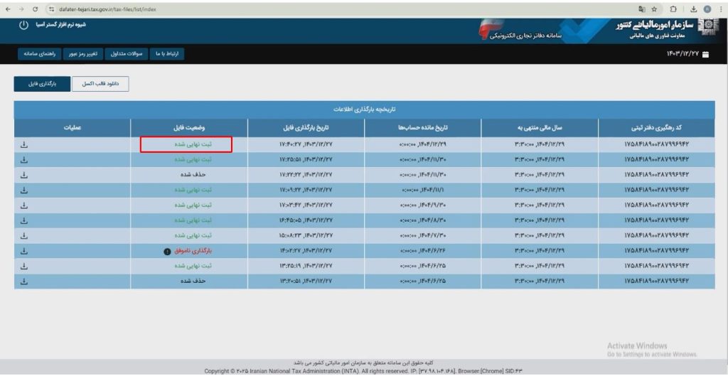 با تایید و ثبت اطلاعات، مطابق شکل زیر جدول تاریخچه بارگذاری اطلاعات به روز شده و وضعیت فایل در ستون مربوطه به ثبت نهایی شده تغییر یافته و فرآیند بارگذاری اطلاعات دفاتر تجاری به اتمام میرسد )در صورت حذف فایل ، وضعیت فایل در ستون مربوطه به حذف شده تغییر می یابد و فرایند بارگذاری فایل باید مجددا انجام شود.( از این پس، با هر بار ورود مؤدی به سامانه جدول تاریخچه بارگذاری اطلاعات در صفحه اول قابل مشاهده است .